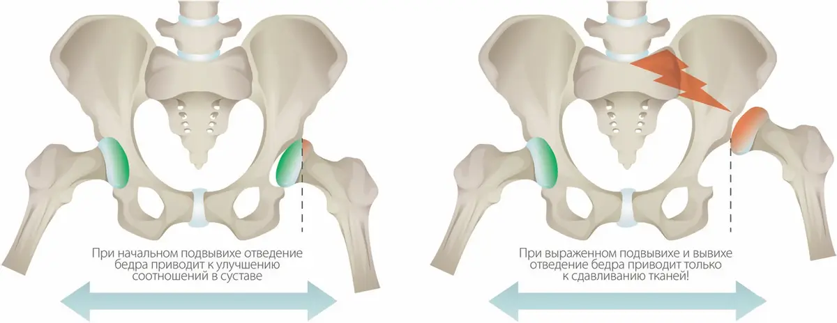 При реконструктивной операции на тазобедренном суставе головка бедра помещается на предусмотренное для нее анатомически место в вертлужной впадине. Стабилизации головки бедра в достигнутом положении осуществляется за счет изменения формы бедренной кости, а также в большинстве за счет определенных манипуляций с тазовой костью по одной из хорошо разработанных методик. После сращения костей сустав стабилизируется в достигнутом положении. Как правило, повторной операции не требуется.