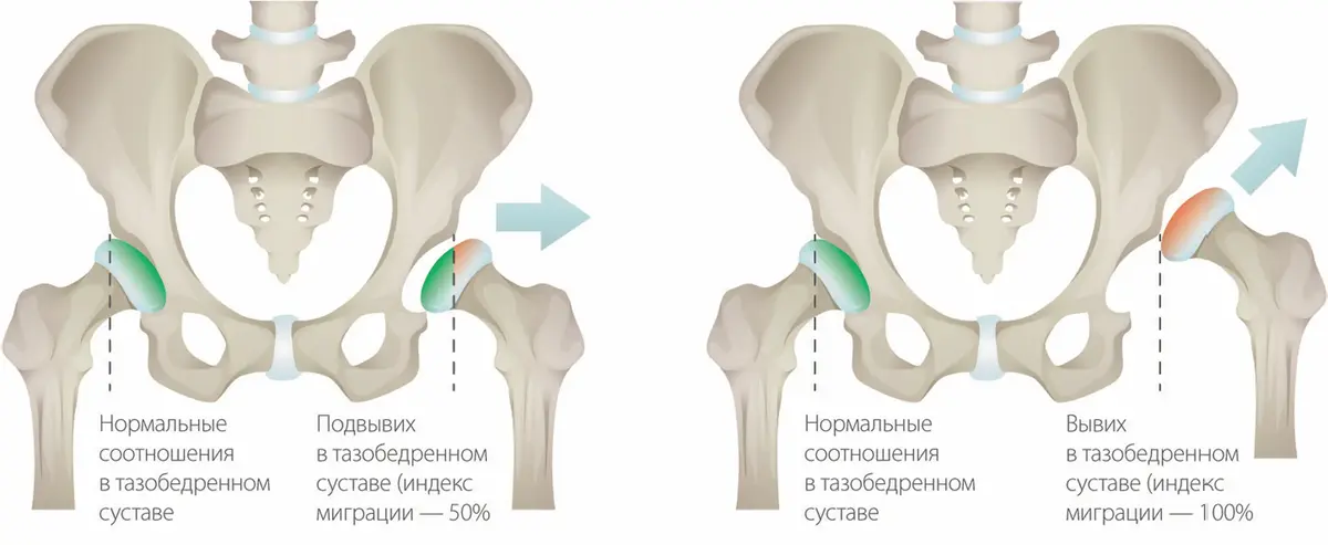 Диагноз «подвывих тазобедренного сустава» устанавливается, если индекс миграции превышает определенную величину (как правило — 30-40 %), то есть головка бедренной кости покрыта сводом вертлужной впадины на две трети или меньше. Подвывих бедра опасен тем, что в большинстве случаев без соответствующего лечения он предшествует вывиху бедра.