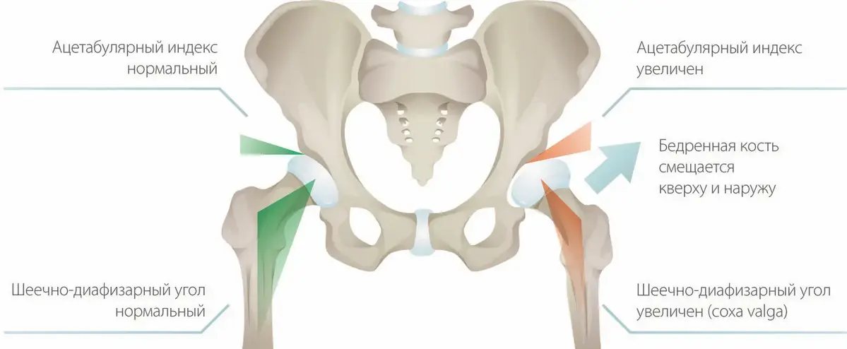 С ортопедической точки зрения термин «дисплазия» в большей степени отражает увеличение ацетабулярного индекса — угла наклона свода вертлужной впадины. При ДЦП более важным является не само по себе наличие дисплазии по данным рентгенограммы, а степень смещения головки бедра (индекс миграции).